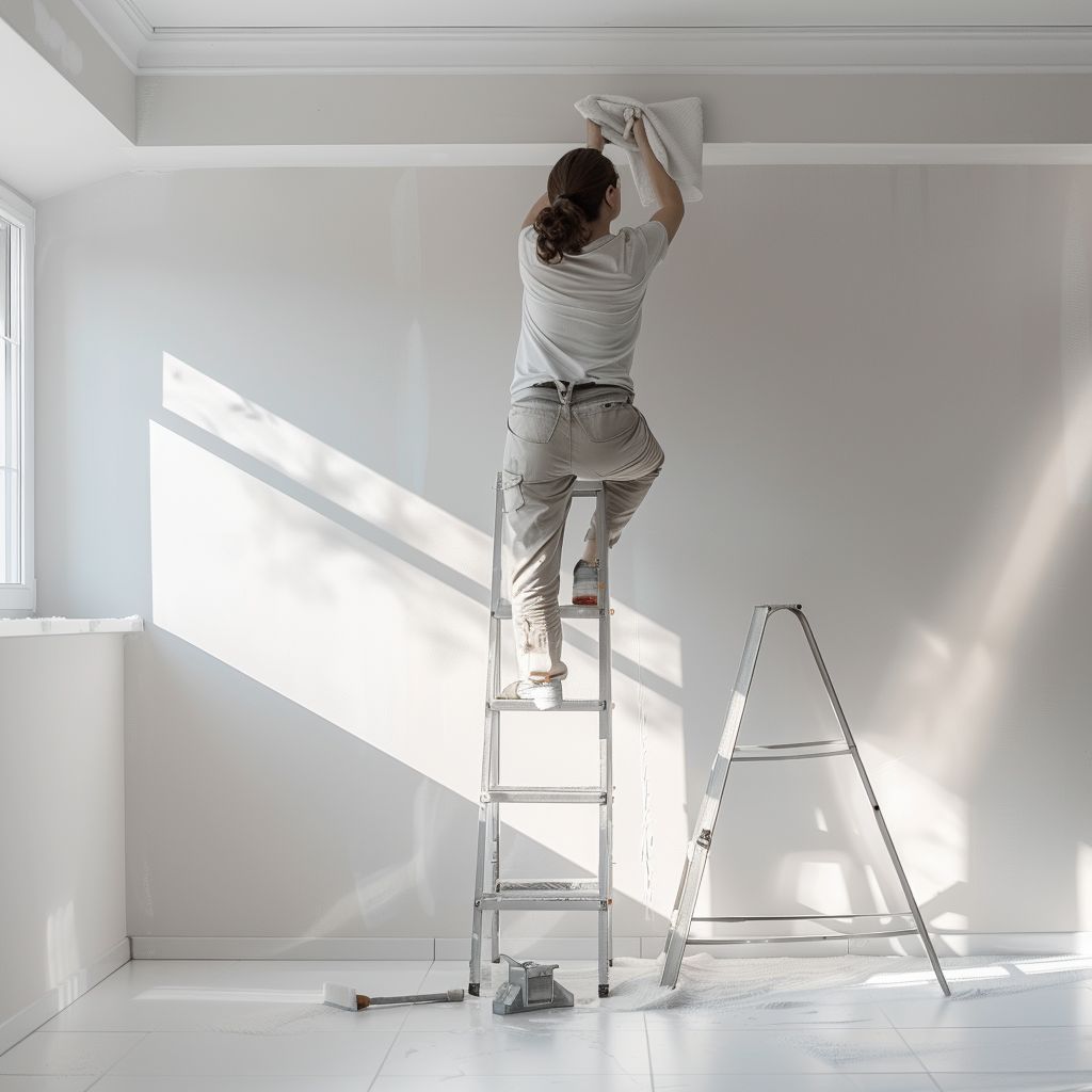 Przed malowaniem sufit należy dokładnie oczyścić z kurzu, pajęczyn i tłuszczu – najlepiej wilgotną szmatką lub mopem. Wszelkie ubytki należy zaszpachlować, a powierzchnię zagruntować, jeśli jest chłonna lub nierówna. Gruntowanie wyrównuje chłonność i poprawia przyczepność farby, co zapobiega smugom. Dobrze jest też zabezpieczyć ściany taśmą malarską i podłogę folią. Im lepiej przygotowana powierzchnia, tym mniej niespodzianek przy malowaniu.