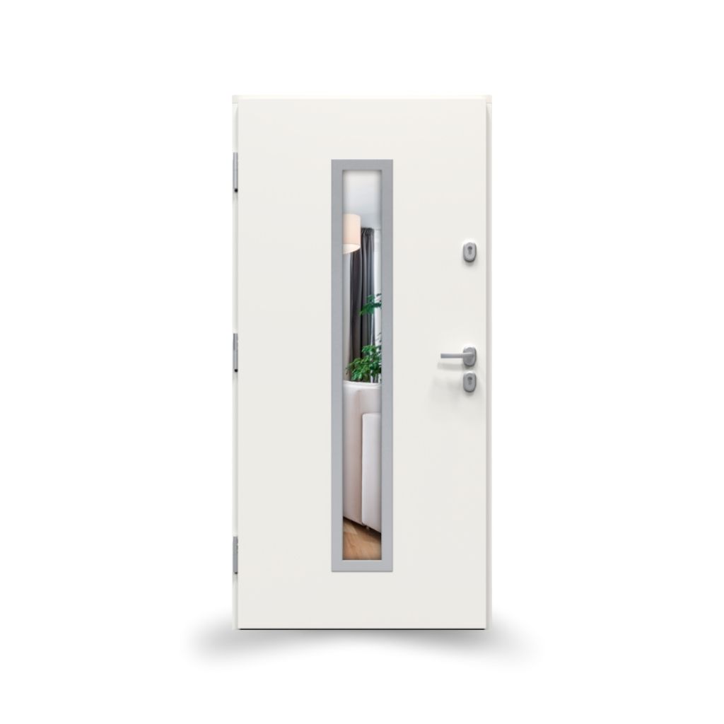 Przeznaczenie: drzwi wejściowe do budynków mieszkalnych – antywłamaniowe, energooszczędne, w eleganckim białym wykończeniu