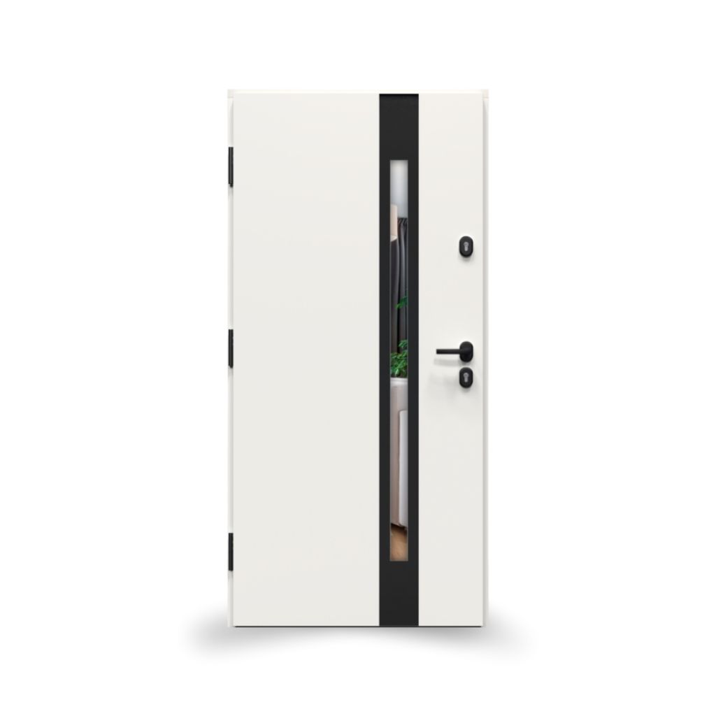 Drzwi GERDA SELECT.MILANO 8B (NS1B) 90E Białe, Lewe, otwierane do wewnątrz to eleganckie i funkcjonalne rozwiązanie dla wymagających domów i mieszkań. Dzięki skrzydłu o grubości 75 mm oraz nowoczesnym materiałom izolacyjnym uzyskano niski współczynnik przenikalności cieplnej (Ud = 1,0 W/m²K), co zapewnia wysoki komfort termiczny i wymierne oszczędności na ogrzewaniu.