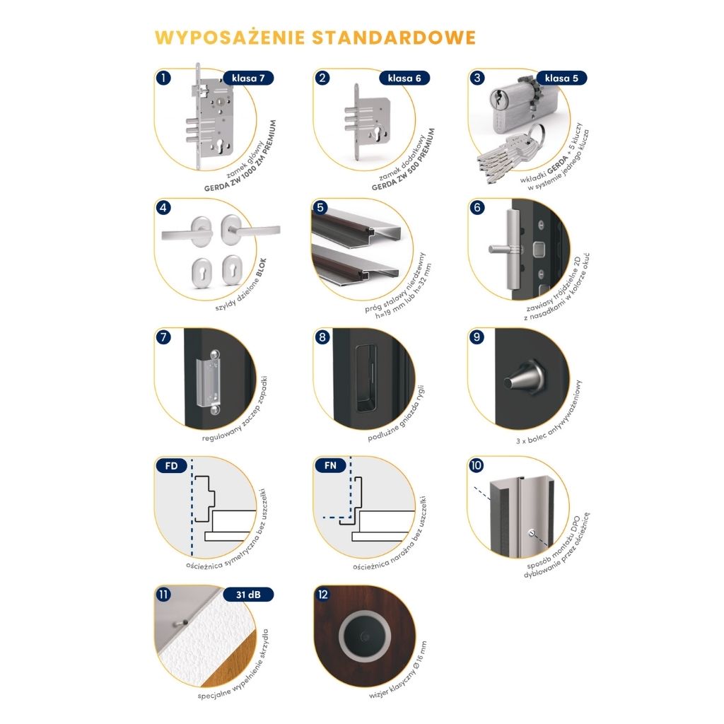 Skrzydło o grubości 60 mm zapewnia dobrą izolację cieplną oraz skuteczne tłumienie dźwięków. Izolacja akustyczna na poziomie 31 dB zwiększa komfort codziennego użytkowania, a współczynnik przenikania ciepła Ud = 1,3 W/m²K pomaga ograniczyć straty energii. Konstrukcja drzwi została zaprojektowana z myślą o trwałości i bezproblemowej eksploatacji przez długie lata.