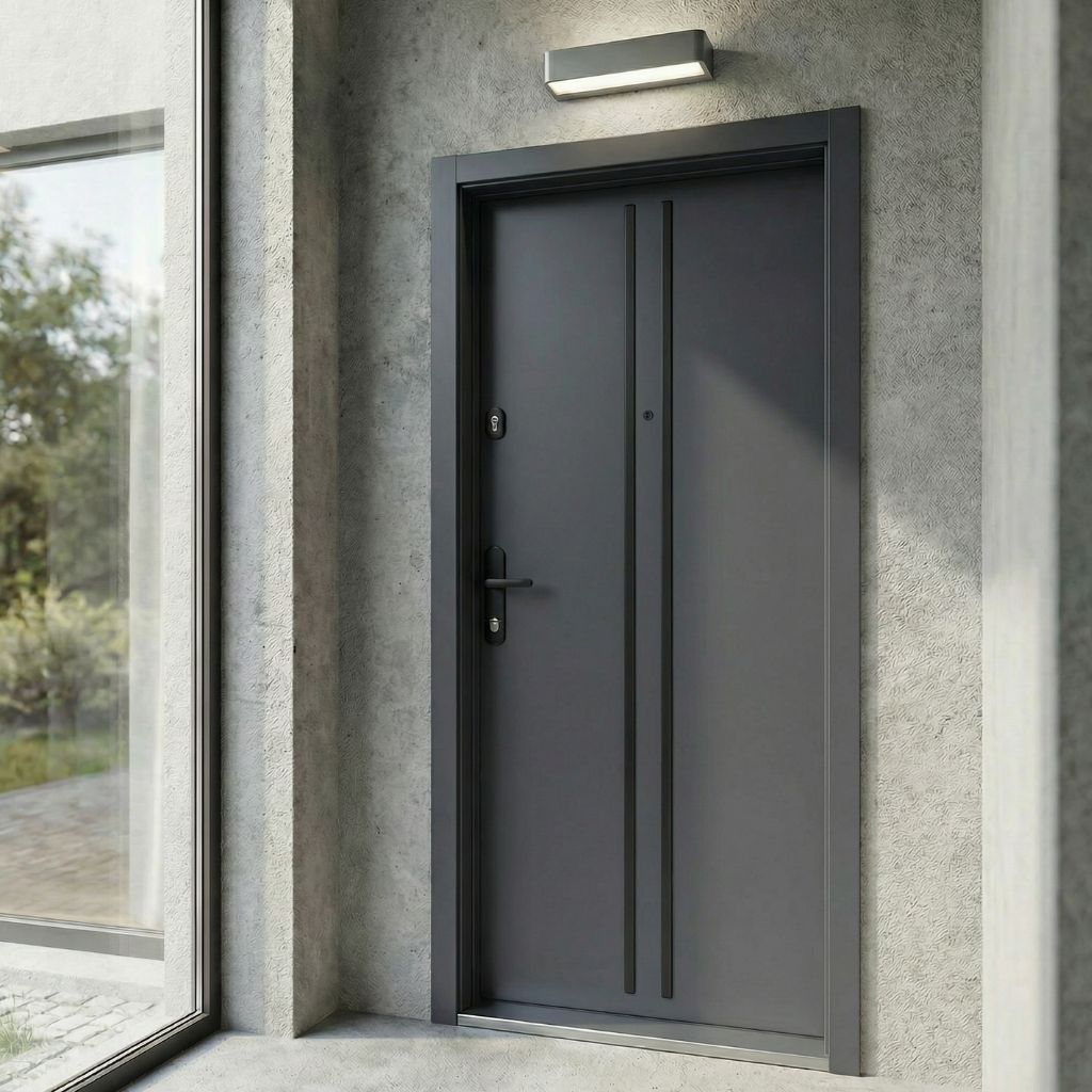 GERDA SIMPLY TOKIO 1 RC2 INSERT INOX w kolorze antracyt z szyldami TD 200 BLOK w anodzie czarnej to połączenie nowoczesnego designu z realnym bezpieczeństwem. Prosta, zdecydowana forma skrzydła została przełamana eleganckim insertem INOX, który dodaje całości technicznej lekkości i wyrafinowania. To drzwi, które mówią spokojnie, ale stanowczo.