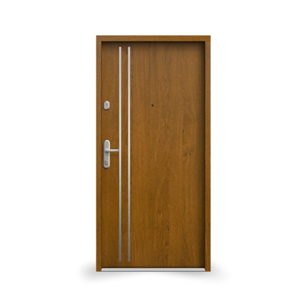 GERDA SIMPLY TOKIO 2 RC2 INSERT INOX w dekorze Winchester z szyldami TD 200 BLOK w kolorze anoda srebrna to połączenie nowoczesnej formy z jasnym, eleganckim wykończeniem okuć. Dwa pionowe inserty INOX porządkują bryłę drzwi i nadają jej architektoniczny charakter, a srebrna anoda wprowadza lekkość i wizualną równowagę.