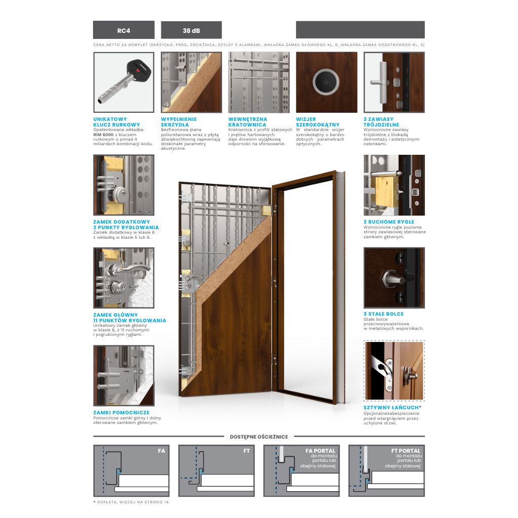 Wnętrze skrzydła wypełnione bezfreonową pianą poliuretanową oraz pakietem wygłuszającym zapewnia nie tylko ochronę, ale też ciszę. Izolacja akustyczna na poziomie 38 dB sprawia, że za drzwiami zostaje świat, którego nie musisz słuchać. To bariera fizyczna i psychiczna jednocześnie.